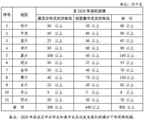 浙江省到2020年的規(guī)劃目標(biāo)為800萬kW,2017年1季度底,累計(jì)安裝了443萬kW,還剩357萬kW的容量。具體各地級市的規(guī)劃目標(biāo)如下表。