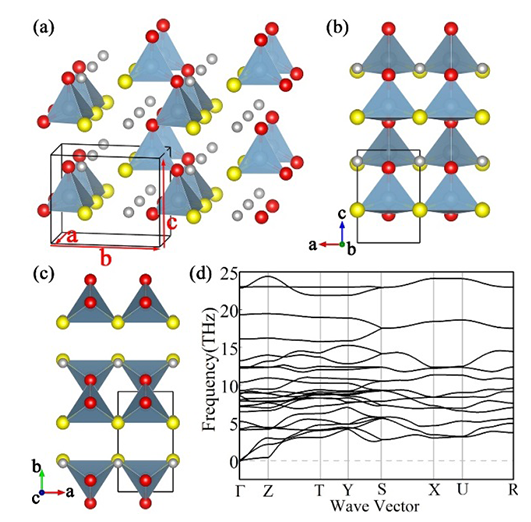 圖1通過計算預測得到的(a)Pmc21空間群LiAlSO的晶體結(jié)構(gòu),沿(b)b-軸和(c)c-軸的視圖以及(d)計算得到的聲子譜。灰色、黃色和紅色的圓球分別代表Li,S和O原子。四面體代表AlS2O2單元。