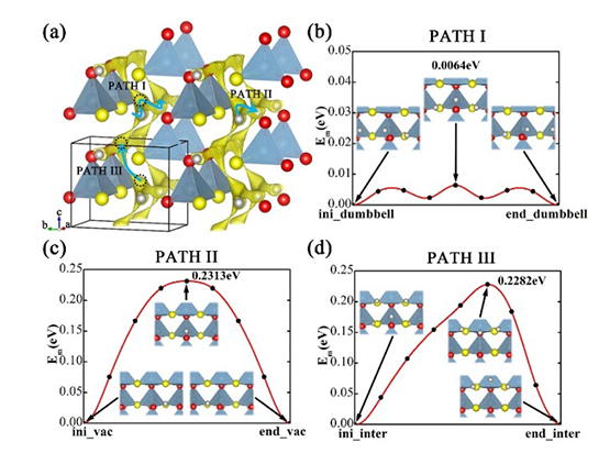 圖2計算得到的Pmc21-LiAlSO的動力學性質(zhì)。(a)通過BVpath程序計算得到的LiAlSO中的鋰離子輸運通道以及由密度泛函方法計算得到(b)Li+沿a方向由間隙離子與晶格位離子協(xié)同運動的遷移勢壘,(c)Li+沿a軸方向空位遷移的勢壘,(d)Li+沿c方向間隙離子遷移的勢壘。材料基因組是近年來興起的材料探索方法,其研究的關(guān)鍵是實現(xiàn)材料研發(fā)的“高通量”,即并發(fā)式完成“一批”而非“一個”材料樣品的計算模擬、制備和表征,實現(xiàn)系統(tǒng)的篩選和優(yōu)化材料,從而加快材料從發(fā)現(xiàn)到應用的過程。在鋰電池中,從改善安全性的角度考慮,全固態(tài)鋰電池被公認為未來二次電池的重要發(fā)展方向。然而使用固體電解質(zhì)材料的一個最大問題是固體電解質(zhì)中鋰離子電導率比常規(guī)液態(tài)電解質(zhì)中低了至少一個數(shù)量級。由于鋰離子的輸運快慢與電池性能息息相關(guān),因此開發(fā)兼具高離子電導率、高穩(wěn)定性、高機械強度的固體電解質(zhì)材料勢在必行。