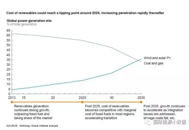 中國(guó)儲(chǔ)能網(wǎng)訊:風(fēng)電、光伏何時(shí)真正可以煤電、氣電競(jìng)爭(zhēng)?知名咨詢(xún)公司麥肯錫預(yù)測(cè),2025年將是風(fēng)電光伏與煤電、燃?xì)獍l(fā)電競(jìng)爭(zhēng)的轉(zhuǎn)折點(diǎn),屆時(shí)風(fēng)電、光伏成本將在全球范圍內(nèi)低于煤電、氣電成本。到2035年,風(fēng)電、光伏在總發(fā)電量的比例將在全球范圍內(nèi)超過(guò)煤電、燃?xì)獍l(fā)電的比例。