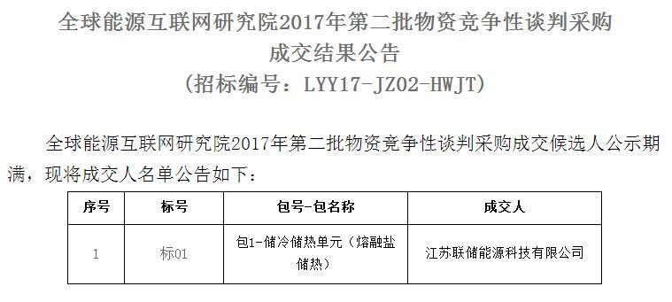 中國儲(chǔ)能網(wǎng)訊:近日,江蘇聯(lián)儲(chǔ)能源科技有限公司成功中標(biāo)全球能源互聯(lián)網(wǎng)研究院第二批物資競爭性談判采購儲(chǔ)冷儲(chǔ)熱單元(熔融鹽儲(chǔ)熱系統(tǒng))。