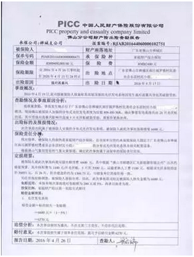 該保險理賠單清楚地展示了被保險的投保金額、理賠金額和事故概況,真實展示了光伏電站的理賠全過程。黎生家的分布式光伏發(fā)電設備共由26片光伏板組成,2016年4月17日因強對流天氣導致5片光伏板損壞,業(yè)主就5片受損組件向保險公司申請修復理賠。對此保險公司給出定損理算: