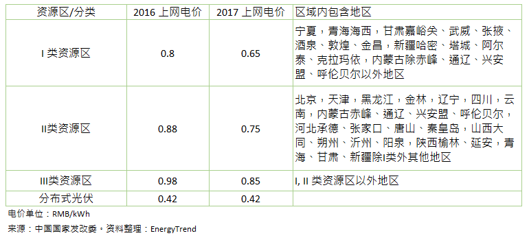 根據(jù)中國國家發(fā)改委的文件《國家發(fā)展改革委關于調整光伏發(fā)電陸上風電報告上網(wǎng)電價的通知》,2017年光伏標竿電價定案如下: