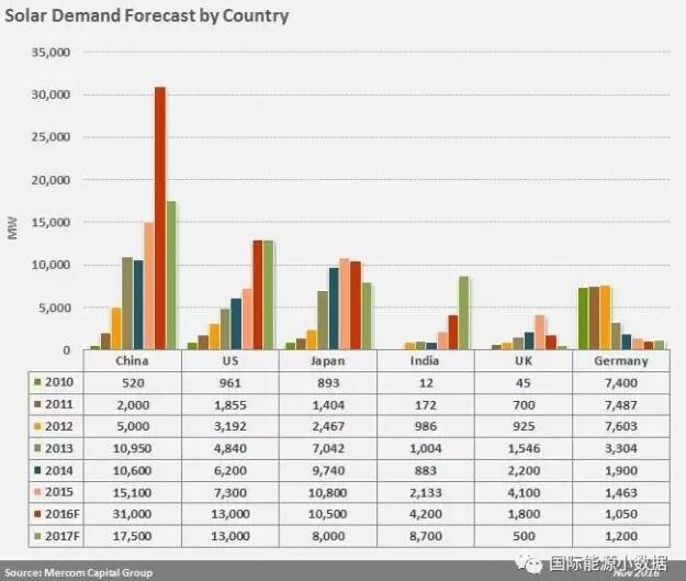 然而,Mercom Capital對2017年光伏新增裝機(jī)的規(guī)模不甚樂觀,與2016年相比可能下降8%(新增70GW),主要是因?yàn)槭艿焦夥鼧?biāo)桿價(jià)下調(diào)的影響,2017年中國的光伏新增裝機(jī)預(yù)計(jì)僅有17GW。