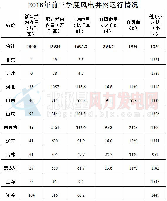 中國(guó)儲(chǔ)能網(wǎng)訊:國(guó)家能源局剛剛公布2016年前三季度風(fēng)電并網(wǎng)運(yùn)行情況。前三季度全國(guó)風(fēng)電新增并網(wǎng)容量1000萬千瓦,截至9月底,累計(jì)并網(wǎng)容量達(dá)到1.39億千瓦;1-9月,全國(guó)風(fēng)電上網(wǎng)電量1693億千瓦時(shí);平均利用小時(shí)數(shù)1251小時(shí);風(fēng)電棄風(fēng)電量394.7億千瓦時(shí),同比增加247億千瓦時(shí);平均棄風(fēng)率19%。以下為前三季度風(fēng)電并網(wǎng)運(yùn)行情況: