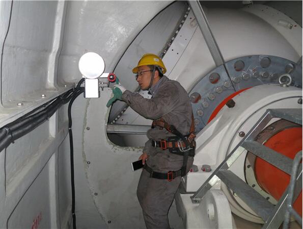 檢查分為兩部分。首先是檢查風機底部各種布線是否規(guī)范、整齊,電纜架是否牢固、扎線是否固定以及機艙內(nèi)火災(zāi)報警器、照明設(shè)備是否靈敏、正常。第二步就是攀援至80米高的機艙部位,針對機艙塔內(nèi)控制柜動力接線盒接線情況、螺栓緊固情況、力矩線是否清晰以及機艙齒輪箱及潤滑系統(tǒng)有無漏油、滲油現(xiàn)象進行全面細致的檢查,發(fā)現(xiàn)問題和隱患,現(xiàn)場立即糾正或消除,確保驗收合格率達100%。