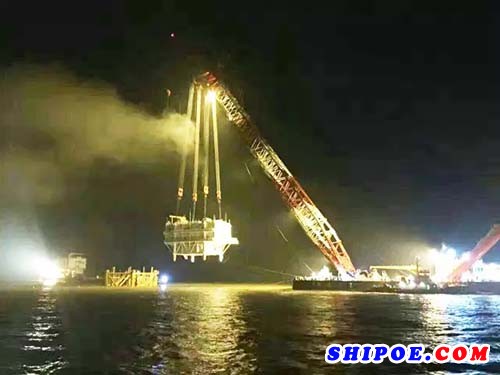 此次完成安裝的是位于南區(qū)的升壓站。由于南區(qū)施工現(xiàn)場海況惡劣,風(fēng)高浪急,安裝過程中還需考慮潮水、漏沙、暗涌、大風(fēng)、水平傾角、加速度等因素,因此,振華重工的項目團(tuán)隊要在有限的時間內(nèi)精確無誤地完成對重達(dá)2300多噸的升壓站的海上移位和吊裝。項目組聯(lián)合龍源振華、港作輪、起重大組、業(yè)主、建造、監(jiān)理、海事局等多家單位專家經(jīng)過反復(fù)討論、實地勘察,最終將吊裝時間定在10月21日凌晨。為確保吊裝安全順利,結(jié)合實際潮水情況,項目組于10月19日下午開始24小時進(jìn)行吊裝前移位、解綁、油漆、掛鉤等準(zhǔn)備工作,于21日凌晨1點起吊,最終,經(jīng)過2個多小時的安裝作業(yè),搶在凌晨5:00大風(fēng)來臨前成功完成了升壓站的海上吊裝。