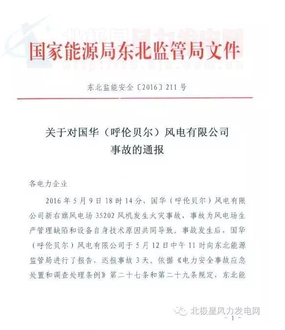 中國(guó)儲(chǔ)能網(wǎng)訊:國(guó)家能源局東北監(jiān)管局近日通報(bào)一起風(fēng)電事故。2016年5月9日,國(guó)華(呼倫貝爾)風(fēng)電有限公司新右旗風(fēng)電場(chǎng)35202風(fēng)機(jī)發(fā)生火災(zāi)事故,經(jīng)調(diào)查事故為風(fēng)電場(chǎng)生產(chǎn)管理缺陷和設(shè)備自身技術(shù)原因共同導(dǎo)致。東北能監(jiān)局依法對(duì)國(guó)華(呼倫貝爾)風(fēng)電有限公司和企業(yè)主要負(fù)責(zé)人進(jìn)行了罰款處理。以下為通報(bào)原文:
