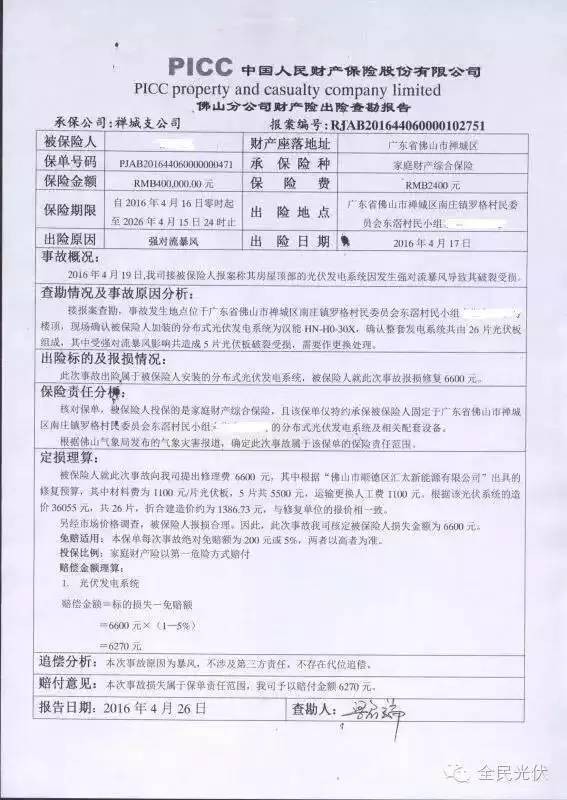 通過以上“中國人保佛山分公司財產(chǎn)險出險查勘報告”,我們可以了解到,黎生給自家的光伏電站投保了2400元的家庭財產(chǎn)綜合保險,最高可理賠40萬元人民幣,保險期限為10年。