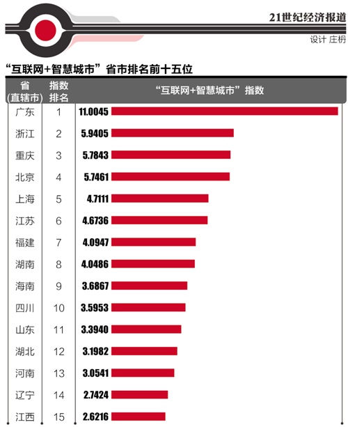 除廣東外,在智慧城市指數(shù)的排名中,浙江、重慶、北京、江蘇分列2至5名。