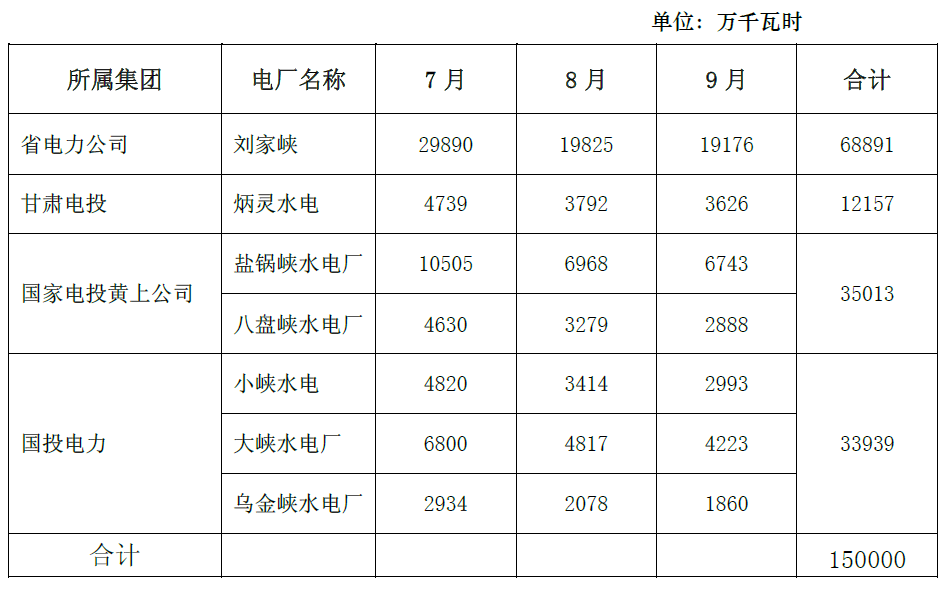 按照各水電企業(yè)裝機(jī)容量占比分擔(dān)。具體為:甘肅電投集團(tuán)1.22億千瓦時,國家電投集團(tuán)黃河上游水電公司3.50億千瓦時,國投集團(tuán)甘肅小三峽水電公司3.39億千瓦時,省電力公司劉家峽水電廠6.89億千瓦時。水電棄水減量原則上集中在7月1日-9月30日。