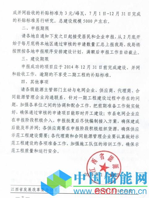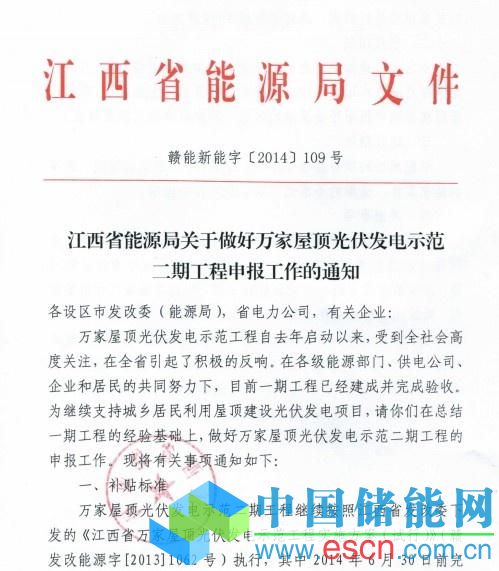 中國儲能網(wǎng)訊:近日,江西省能源局下發(fā)《關(guān)于做好萬家屋頂光伏發(fā)電示范二期工程申報工作的通知》。據(jù)悉,江西省2014年6月30日完成并網(wǎng)驗收給予3元/W補貼,7月1日-12月31日完成補貼另行研究,總規(guī)模5000戶左右。