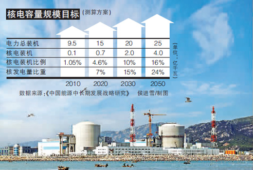 研究結論指出,我國加速發(fā)展核電是必要的、迫切的。2020年核電總裝機規(guī)模達到7000萬千瓦的目標是可能實現的;2050年,核電總裝機容量達到4億千瓦,核電成為電力工業(yè)的主流之一。核電發(fā)電量占總發(fā)電量的比重為24%,核電裝機容量占總裝機容量的16%。