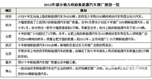 2012年,國(guó)家已經(jīng)出臺(tái)的推廣節(jié)能和新能源汽車的鼓勵(lì)政策主要有三項(xiàng),一是開展節(jié)能與新能源汽車示范推廣試點(diǎn)。二是在5個(gè)試點(diǎn)城市開展私人購買新能源汽車補(bǔ)貼試點(diǎn)。三是對(duì)消費(fèi)者購買“節(jié)能產(chǎn)品惠民工程”節(jié)能汽車給予一次性定額補(bǔ)助。