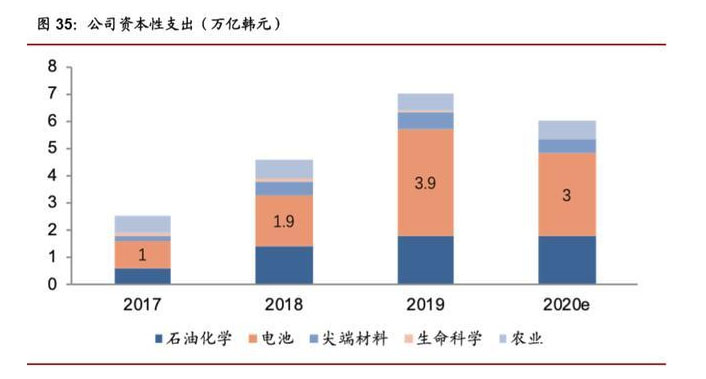 資本性支出逐年遞增,電池業(yè)務(wù)的資本性支出占比最多。2019 年電池業(yè)務(wù)的資本 性支出為 3.9 萬(wàn)億韓元,預(yù)計(jì) 2020 年為 3 萬(wàn)億韓元,LG 在 2020 年會(huì)繼續(xù)增加 動(dòng)力電池產(chǎn)能,到 2020 年底預(yù)計(jì)整體產(chǎn)能將達(dá)到 100GWh。為配合下游整體市 場(chǎng)增長(zhǎng),確保在短時(shí)間內(nèi)滿足客戶的需求并保持成本競(jìng)爭(zhēng)力,大約 80%的產(chǎn)能將 位于中國(guó)和歐洲。