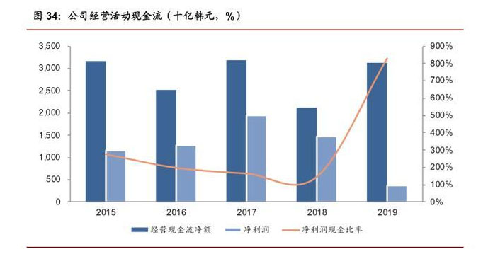 公司經(jīng)營(yíng)活動(dòng)現(xiàn)金流凈額小幅波動(dòng),2019 年為 183 億元,同比增加 47.01%; 2015-2018 年凈利潤(rùn)現(xiàn)金比率較為平穩(wěn),2019 年大幅上升至 8.31,主要因?yàn)槭?ESS 火災(zāi)相關(guān)的一次性費(fèi)用的影響,利潤(rùn)規(guī)模大幅縮小。