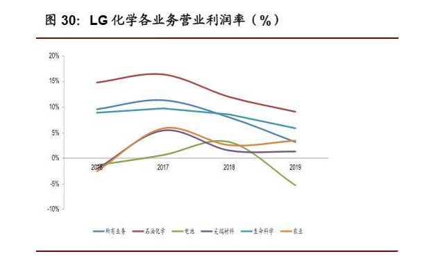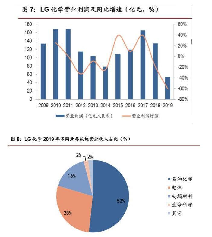 2019 年 LG 化學(xué)實(shí)現(xiàn)銷(xiāo)售額約合人民幣 1709 億元,同比增加 1.60%。從各業(yè)務(wù) 營(yíng)收來(lái)看,石油化工板塊是公司最大的業(yè)績(jī)來(lái)源,2019 年的營(yíng)收占比為 52%。 電池事業(yè)部的營(yíng)收占比在快速增加,2019 年占比達(dá)到 28%,電池業(yè)務(wù)占比較 2018 年增加 5 個(gè)百分點(diǎn),預(yù)計(jì)隨著公司動(dòng)力電池業(yè)務(wù)的不斷發(fā)展,電池業(yè)務(wù)營(yíng) 收占比將會(huì)繼續(xù)提升。2019 年 LG 化學(xué)實(shí)現(xiàn)營(yíng)業(yè)利潤(rùn)約合人民幣 53.47 億元,同 比減少約 60.11%,盈利大幅下降主要原因是為應(yīng)對(duì)儲(chǔ)能電池火災(zāi)事故提取準(zhǔn)備 金所產(chǎn)生的非經(jīng)常性虧損。