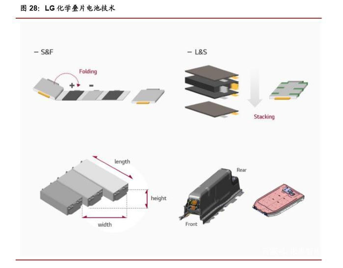LG 化學(xué)目前采用的電芯主要路線為軟包電池,在動(dòng)力電池封裝方面,采用疊片 式軟包設(shè)計(jì)。LG 電池電芯目前生產(chǎn)工藝主要為 Stack&Folding 堆疊工藝,復(fù)合電極材料置于一張隔膜上以折疊的工序完成組裝,減少了電極開(kāi)裂的可能性,并有助于制作更加輕薄的電池,另外擁有高容量和高密度,發(fā)熱面積較大可以調(diào)節(jié)最適當(dāng)?shù)臏囟?,有利于保持長(zhǎng)壽命與高性能。下一代電芯將采用新型的生產(chǎn)工藝:層壓工藝,能夠更適于生產(chǎn)高能量密度的電芯,同時(shí)通過(guò)簡(jiǎn)化生產(chǎn)工藝,縮短電芯的單產(chǎn)時(shí)間。LG 化學(xué)在這種工藝方面具有獨(dú)家專(zhuān)利,層壓工藝能夠?qū)?Cell 內(nèi)部的死角空間最小化,保障電芯的長(zhǎng)循環(huán)壽命,同時(shí)通過(guò) LG化學(xué)高可靠 性隔膜讓電芯具有較好的熱穩(wěn)定性。