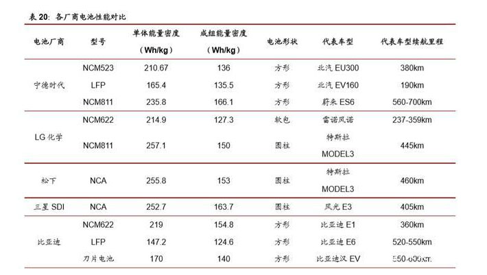 目前除寧德時(shí)代、比亞迪量產(chǎn)磷酸鐵鋰電池以外,其余各廠商都為三元鋰電池;LG 化學(xué)是唯一使用軟包外形的電池廠商,相比于方形鋁殼電池及圓柱電池,軟包電池在發(fā)生安全隱患的時(shí)候一般先脹氣,或者從沖破封印處釋放能量,不易發(fā)生爆炸,因而安全性能更高,同等容量的軟包電池要比方形鋁殼輕,具有更高的能量密度。此外,軟包電池的形狀可根據(jù)客戶的需求定制,設(shè)計(jì)上更加靈活,在新型號(hào)的電池開(kāi)發(fā)上更占優(yōu)勢(shì)。通過(guò)對(duì)比各廠商已經(jīng)量產(chǎn)的不同型號(hào)動(dòng)力電池性能, LG 化學(xué) NCM811 圓柱電池的單體能量密度達(dá)到 257.1 Wh/kg 排名第一。