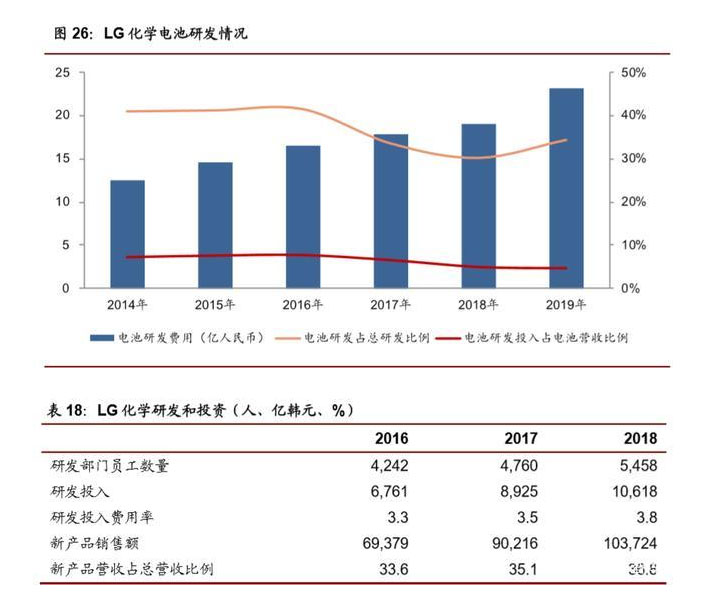 LG 化學(xué)在電池方面的研發(fā)投入與研發(fā)費(fèi)用率處于行業(yè)領(lǐng)先。電池業(yè)務(wù)的研發(fā)費(fèi) 用穩(wěn)步增長(zhǎng),從 2014 年的 12.53 億元增長(zhǎng)到 2019 年的 23.15 億元,復(fù)合增長(zhǎng)率 達(dá)到 13.06%;電池研發(fā)占總研發(fā)比例在 30%-40%之間,電池業(yè)務(wù)收入占總收入 比例從 16 年的 17%增長(zhǎng)到 19 年的 28%,LG 化學(xué)前期在電池業(yè)務(wù)研發(fā)的投入初 見(jiàn)成效。2014~2017 年的電池業(yè)務(wù)的研發(fā)費(fèi)用率在 7%左右,電池業(yè)務(wù)收入的增 長(zhǎng)使得 2018、2019 年的研發(fā)費(fèi)用率分別下降到 4.92%、4.62%。高研發(fā)費(fèi)用下, LG 化學(xué)新產(chǎn)品收入占總收入比例不斷上升,2019 年達(dá)到 36.8%。