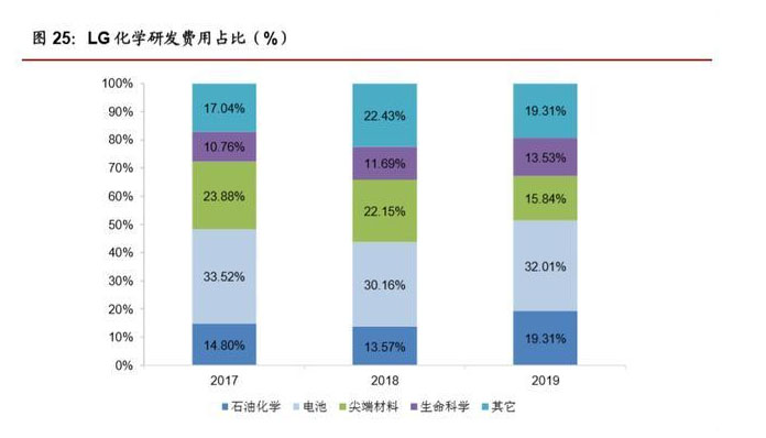 電池業(yè)務(wù)是 LG 化學(xué)的重點(diǎn)發(fā)展業(yè)務(wù)。近幾年電池業(yè)務(wù)的研發(fā)費(fèi)用占 LG 化學(xué)全 部研發(fā)費(fèi)用的比率一直在 30%以上,是研發(fā)經(jīng)費(fèi)投入占比最高的業(yè)務(wù)板塊。根據(jù) LG 化學(xué)制定的一份未來(lái) 5 年的新計(jì)劃,到 2024 年,公司鋰電池銷(xiāo)售額將增加約 5 倍,預(yù)計(jì)將占公司總營(yíng)收的 50%左右。屆時(shí)動(dòng)力電池銷(xiāo)售將成為 LG 化學(xué)最大 的業(yè)務(wù)部分。