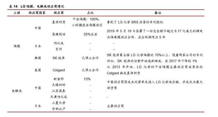 LG 化學(xué)的隔膜供應(yīng)商早期以旭化成、東麗、SK 能源和 Celgard 為主,后 LG 化學(xué)與 SK 能源關(guān)系破裂,2013 年以星源材質(zhì)取代 Celgard。2019 年恩捷股份獲 得 LG 化學(xué)大額訂單,切入濕法隔膜供應(yīng),目前 LG 化學(xué)的隔膜供應(yīng)由中國(guó)企業(yè) 主導(dǎo)。