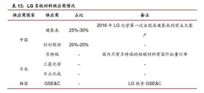 LG 化學(xué)初期的負(fù)極材料供應(yīng)商是三菱化學(xué)和日立化成,近幾年中國(guó)供應(yīng)商璞泰來(lái)、杉杉股份的份額不斷上升,成為負(fù)極材料的主要供應(yīng)商。特斯拉訂單的交付將進(jìn)一步拉動(dòng) LG 對(duì)負(fù)極材料的需求,國(guó)內(nèi)供應(yīng)商份額有望繼續(xù)上升。