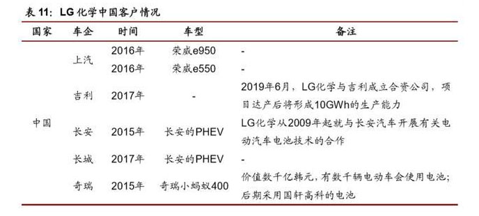 LG 化學(xué)在中國(guó)的主要客戶是吉利。2017 年吉利收購(gòu)了 LG 南京工廠后,LG 將幫 助吉利集團(tuán)升級(jí)了電池技術(shù),該工廠產(chǎn)能 1GWh,可以供應(yīng) 8 萬(wàn)輛混合動(dòng)力汽車(chē) 的電池需求。2019 年,LG 化學(xué)與吉利成立合資公司,項(xiàng)目達(dá)產(chǎn)后將形成 10GWh 的生產(chǎn)能力。
