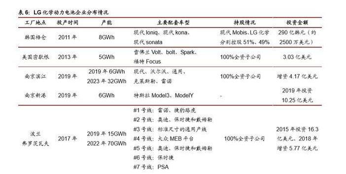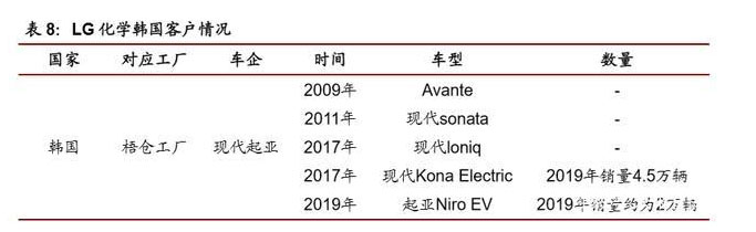 2007 年 LG 公司獲得現(xiàn)代汽車(chē)訂單,2009 年 LG 化學(xué)的第一款動(dòng)力電池由現(xiàn)代 起亞共同研發(fā),LG 化學(xué)的第一家動(dòng)力電池工廠——韓國(guó)梧倉(cāng)工廠由現(xiàn)代 Mobis 和 LG 化學(xué)合資建立。與現(xiàn)代起亞的合作,是 LG 化學(xué)首次將自主研發(fā)生產(chǎn)的鋰 電池應(yīng)用于商用電動(dòng)車(chē),開(kāi)啟了 LG 化學(xué)在動(dòng)力電池的應(yīng)用步伐。十幾年來(lái) LG 化學(xué)為現(xiàn)代 sonata、現(xiàn)代 loniq、起亞 Niro EV 等多款車(chē)型提供動(dòng)力電池。2019 年 LG 化學(xué)向現(xiàn)代企業(yè)提供了 7.8 萬(wàn)輛車(chē)的動(dòng)力電池,2020 年現(xiàn)代汽車(chē)和 LG 化 學(xué)討論組建合資企業(yè),計(jì)劃在其它國(guó)家組建電池相關(guān)的合資公司。