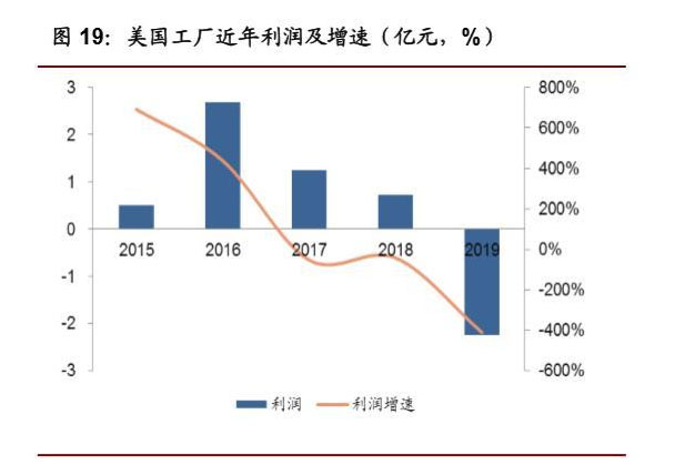 美國(guó)工廠在 2013~2019 年間收入保持上漲,但近兩年增速趨緩。2019 年收入約 合人民幣 23.78 億元,利潤(rùn)為-2.25 億元。美國(guó)工廠近五年來(lái)首次出現(xiàn)虧損,主 要受近年美國(guó)新能源汽車(chē)市場(chǎng)增長(zhǎng)放緩的影響。