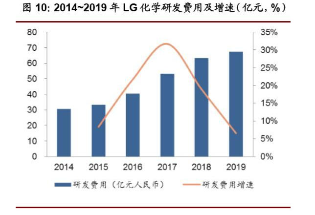 2019 年 LG 化學(xué)資本支出約合人民幣 414 億元,同比增長(zhǎng)約 50%。2014~2019 年的資本性支出年均復(fù)合增速約 34.41%。近年公司研發(fā)費(fèi)用不斷增長(zhǎng),2019 年 研發(fā)費(fèi)用約合人民幣 67.55 億元,近 5 年研發(fā)費(fèi)用年均復(fù)合增長(zhǎng)率約為 17.11%。