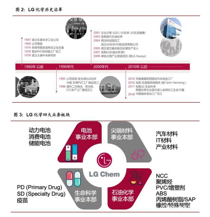 LG 化學(xué)總部位于韓國(guó)首爾,自 1947 年創(chuàng)立以來(lái)經(jīng)過(guò) 70 余年的不斷發(fā)展,公司 成長(zhǎng)為韓國(guó)最大的綜合化學(xué)公司。2017 年,LG 化學(xué)位居全球化工行業(yè)最有價(jià)值 的化學(xué)品牌排行第四名。LG 化學(xué)的業(yè)務(wù)目前分為石油化學(xué)事業(yè)部、電池事業(yè)部、 尖端材料事業(yè)部和生命科學(xué)事業(yè)部,2019 年電池事業(yè)部貢獻(xiàn)了公司營(yíng)業(yè)收入的 28%。