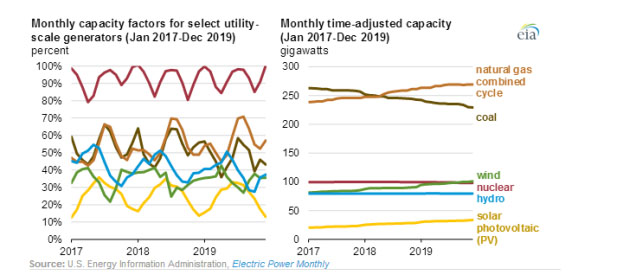 容量因數(shù)用于衡量各種能源發(fā)電設(shè)施的運行強度。在美國能源信息管理署(EIA)的研究中,通過將發(fā)電設(shè)施日常發(fā)電量除以發(fā)電設(shè)施以滿功率運行產(chǎn)生的最大發(fā)電量來計算容量因數(shù)。容量因數(shù)為100%時意味著發(fā)電機組一直在滿功率運行。月度和年度總可用容量都是基于美國能源信息管理署(EIA)調(diào)查的發(fā)電量和容量值進行計算。