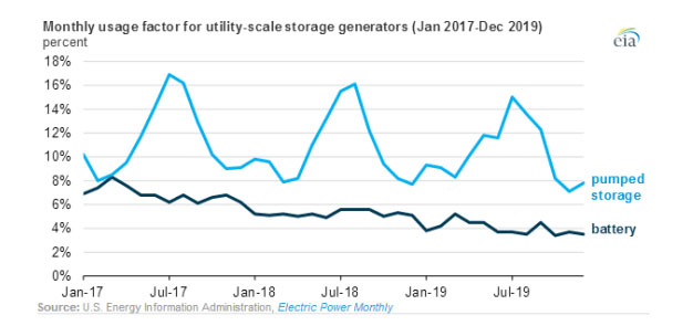 迄今為止,抽水蓄能設(shè)施是美國最大的儲能容量來源。抽水蓄能設(shè)施的使用率通常遵循總電力需求的模式:夏季和冬季使用率較高,春季和秋季較低。相比之下,電池儲能系統(tǒng)的使用因數(shù)相對較低且季節(jié)性變化較小。越來越多的電網(wǎng)運營商近年來部署了電池存儲系統(tǒng)以提供多種服務(wù)。