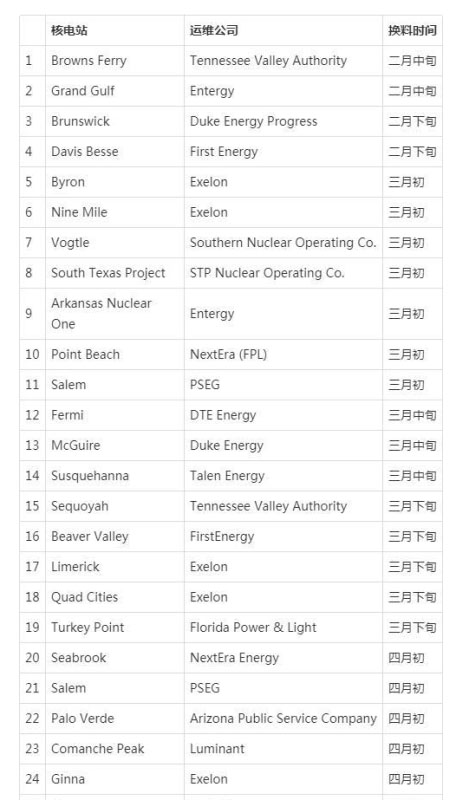 根據(jù)核監(jiān)管委員會(NRC)的數(shù)據(jù):美國核電站反應(yīng)堆換料的平均時間從2012年的46天縮短到了32天,截至3月25日,美國96座商用核反應(yīng)堆中有13座因換料而中斷離線,總量約100 GW(16.9%)。
