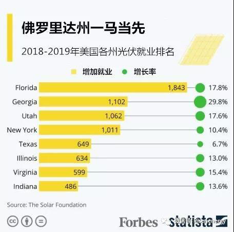 2019年,美國31個州的太陽能產(chǎn)業(yè)就業(yè)人數(shù)有所增加,其中佛羅里達州首當其沖。陽光之州擴大了戶用和公用事業(yè)太陽能的安裝,而太陽能租賃的增加使安裝商可以為客戶提供有吸引力的融資選擇。在2018年至2019年期間,佛羅里達州增加了1,843個工作崗位,是美國各州中增加工作崗位最多的州??傮w而言,美國東南部地區(qū)是今年就業(yè)普查的一個亮點,在公用事業(yè)規(guī)模擴張和新的制造業(yè)就業(yè)機會的推動下,該地區(qū)出現(xiàn)了強勁的就業(yè)增長。整個地區(qū)總共增加了3700個工作崗位。