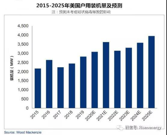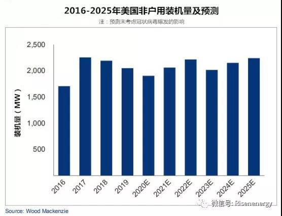 Wood Mackenzie預測2020年美國光伏產(chǎn)業(yè)的年增長率為47%,預計裝機量將達到20GW。在未來五年中,美國光伏總裝機容量將增加一倍以上,到2021年,年裝機規(guī)模將達到20.4GW。到2025年,將有三分之一的戶用太陽能系統(tǒng)和四分之一的非戶用太陽能系統(tǒng)配備儲能。