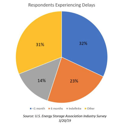 62%的受訪(fǎng)者表示,其開(kāi)發(fā)的儲(chǔ)能項(xiàng)目已經(jīng)延誤;而66%的受訪(fǎng)者表示其計(jì)劃開(kāi)發(fā)的項(xiàng)目可能出現(xiàn)延誤。