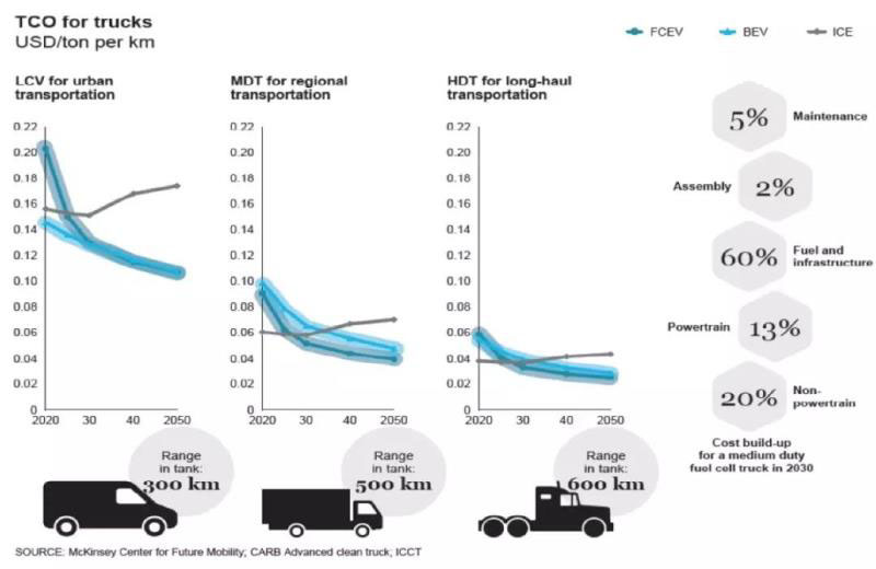 氫尤其適合16噸以上的長途卡車。對于長途卡車,氫被認(rèn)為是最有前途的碳中性解決方案。氫也可以作為區(qū)域分配和其他需要高耗能的應(yīng)用(例如,冷藏車/垃圾車)的合適解決方案。