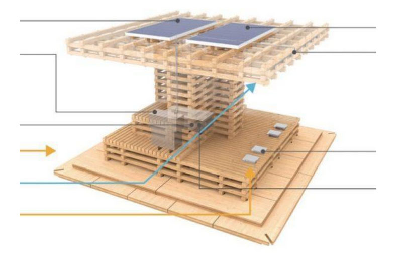 這些公司將該產(chǎn)品宣傳為城市的“熱點”。這個裝置的結(jié)構(gòu)特點是4.8 m?的底板和4 m?的屋頂,中間的空間是休息區(qū)。在該裝置的頂部有一個蒸發(fā)器,玻璃屋頂?shù)脑O計可防止直射陽光的傷害。因為Cool Tree Lite是由柏木制成的,所以它需要由螺栓連接起來,這種結(jié)構(gòu)方便根據(jù)特殊場合的需求拆卸和重新組裝。