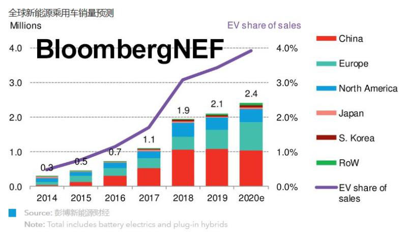 2011-2018年期間,全球乘用車銷售平均增長率為79%,2019年全球乘用車銷售增長率降至10%。BNEF預計2020年全球乘用車銷售增長率約為13%。