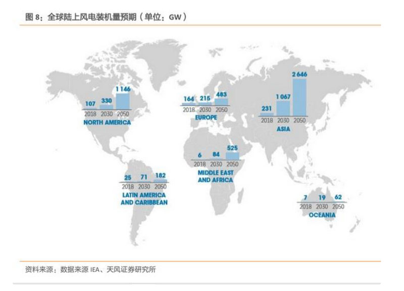 直到到2050年,亞洲將始終主導(dǎo)全球陸上風(fēng)力發(fā)電設(shè)施,其次是北美和歐洲。我們認(rèn)為,中國和美國是貢獻(xiàn)裝機(jī)量的核心力量。受補(bǔ)貼政策影響,中國和美國的風(fēng)電裝機(jī)量在2020年會(huì)出現(xiàn)臨時(shí)性的增長,搶裝結(jié)束后,預(yù)期全球每年的新增裝機(jī)預(yù)期將保持在60GW以上。根據(jù)GWEC數(shù)據(jù),到2023年全球風(fēng)電累計(jì)裝機(jī)有望達(dá)到900GW。
