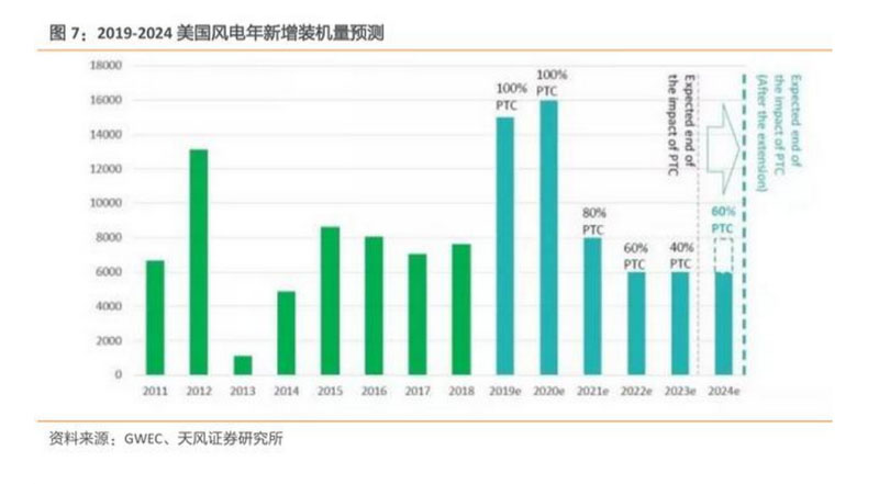 2019年12月19日,美國國會(huì)通過了一項(xiàng)支出和稅收法案,將目前的陸上風(fēng)電生產(chǎn)稅收抵免再延長一年。如果2020年開始建設(shè),將享受60%的生產(chǎn)稅收抵免,相當(dāng)于1.5美分/kwh。這意味著美國將在2024年再次經(jīng)歷一輪搶裝。