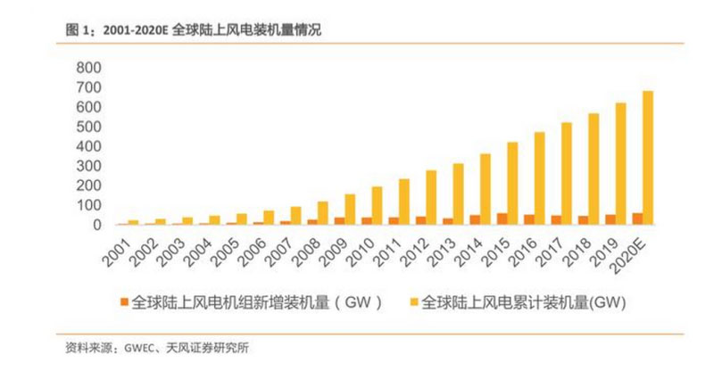 從2001年至2019年,全球陸上風(fēng)電實(shí)現(xiàn)了快速發(fā)展。從目前的發(fā)展?fàn)顩r來看,主要可以分為三個(gè)階段。第一階段是2001-2008年,全球風(fēng)電行業(yè)處于迅速發(fā)展期,新增風(fēng)電裝機(jī)容量年復(fù)合增長率22.5%。第二階段是在2009-2012年,可以稱為全球風(fēng)電整合期,年度裝機(jī)增速放緩,新增風(fēng)電裝機(jī)量年復(fù)合增長率下降至5%;第三階段是2013至2019年底,全球風(fēng)電再次進(jìn)入成長期,中國是這次成長的重要貢獻(xiàn)者,該階段風(fēng)機(jī)整機(jī)應(yīng)用技術(shù)提升、電場(chǎng)管理效率增強(qiáng)、度電成本優(yōu)勢(shì)逐步顯現(xiàn),新增風(fēng)電裝機(jī)年復(fù)合增長率達(dá)到7.49%。