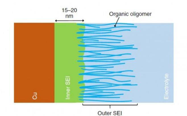 在電池充電初期,電極/電解質(zhì)界面會形成電雙層。這種雙層結(jié)構(gòu)導(dǎo)致SEI的微結(jié)構(gòu)和化學(xué)差異,并最終決定電池性能。從分子水平上了解這種界面,可以為更好地設(shè)計電池提供有力指導(dǎo)。研究人員發(fā)現(xiàn),初始充電期間,在任何相間化學(xué)反應(yīng)發(fā)生之前,由于溶劑分子自組合,電極/電解質(zhì)界面上會形成雙電層。這是受鋰離子和電極表面電位的影響。這一雙層結(jié)構(gòu)預(yù)測最終的相間化學(xué),特別是帶負(fù)電荷的電極表面,排斥來自內(nèi)層的鹽陰離子,從而在內(nèi)部產(chǎn)生薄且致密的無機(jī)SEI。正是這一致密層負(fù)責(zé)傳導(dǎo)Li +和絕緣電子,這是SEI的主要功能。內(nèi)層形成后,出現(xiàn)電解質(zhì)可滲透且富含有機(jī)物的外層。在高濃度富氟電解質(zhì)存在的情況下,由于雙層中存在陰離子,SEI內(nèi)層的LiF濃度較高。此類實時納米級觀測,將有助于為未來的電池設(shè)計更好的界面。