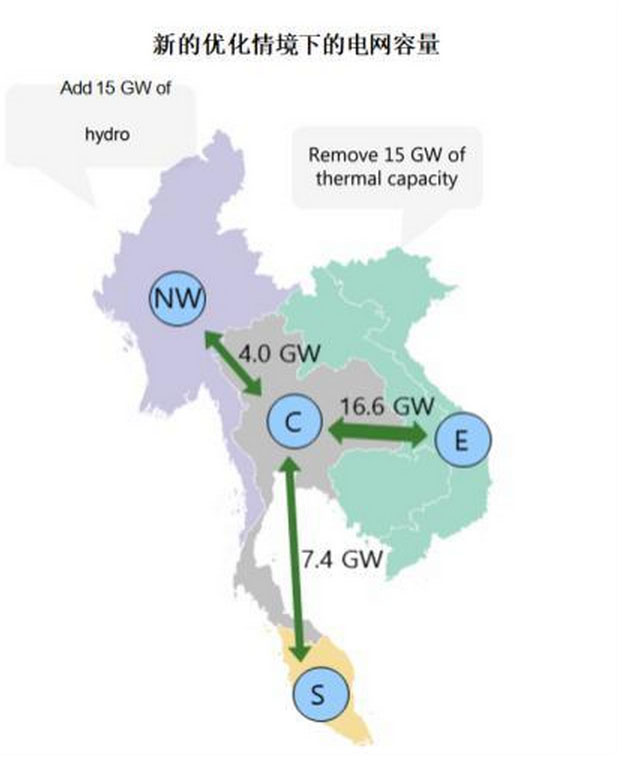 優(yōu)化情景下,協(xié)調(diào)電力系統(tǒng)規(guī)劃,可以進(jìn)一步提升互聯(lián)線路的效益,降低運(yùn)行成本、減少碳排放。西北區(qū)域水電資源豐富,足夠滿足本地電力需求,通過增容電網(wǎng)輸電將給整個東盟帶來更多的經(jīng)濟(jì)、環(huán)境效益。