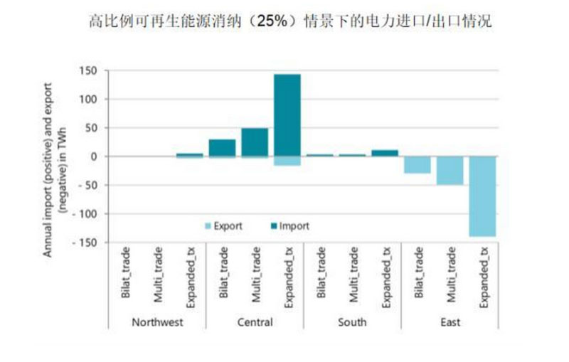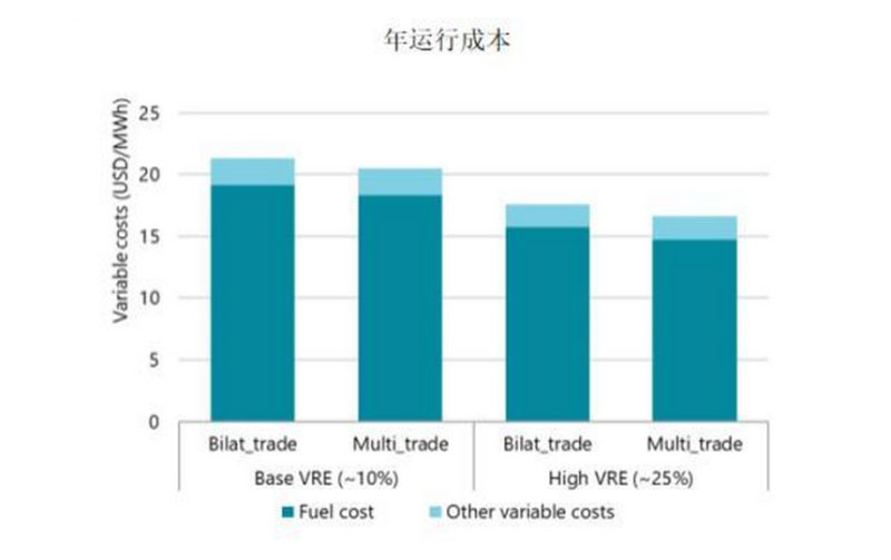 增加可再生能源消納比例可釋放互聯(lián)線路和多邊電力貿(mào)易的優(yōu)勢。借助跨境互連,更高比例的可再生能源將被消納,從而降低了成本和二氧化碳排放。