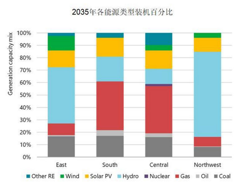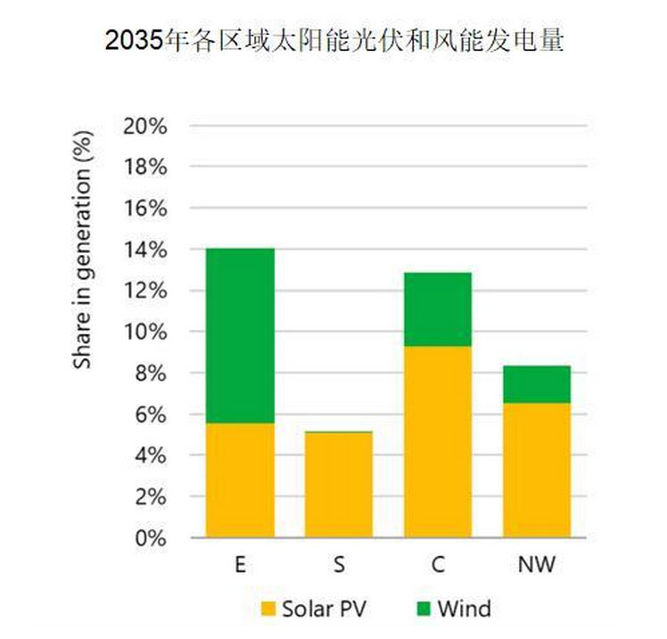 2035年各區(qū)域太陽能光伏和風(fēng)電裝機(jī)將達(dá)到10%至20%。在積極情景的條件下,2035年,東部、南部、中部、西北部太陽能光伏和風(fēng)電裝機(jī)將達(dá)到約25%、15%、20%、15%。