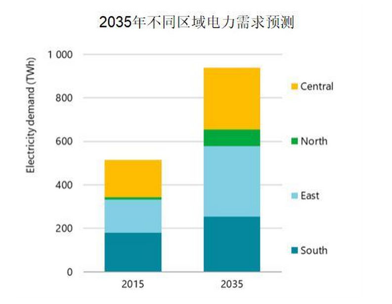 2015至2035年期間電力需求快速增長。在積極情景的條件下(基于東盟能源中心于2016年發(fā)布的第五版《東盟能源展望》),2035年,東盟電力需求預(yù)計較2015年將增長80%。東部區(qū)域增速較快,至2035年時電力需求最大,平均負(fù)荷水平最高。西北部區(qū)域需求最小,負(fù)荷水平最低。各區(qū)域電力需求均有較快增長。