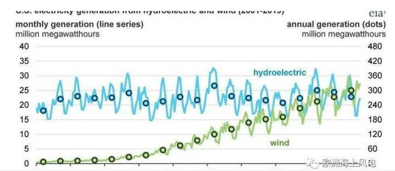 上圖中的空心圓點及右側(cè)坐標(biāo)展示了2001~2019年美國水電和風(fēng)電的年度發(fā)電量??梢钥吹剑陙?,水電發(fā)電量較為穩(wěn)定,處在230~320太瓦時之間,而風(fēng)電則突飛猛進(jìn),從2001年小到小編都讀不出的坐標(biāo)值,增長到2019年的300太瓦時,占全國發(fā)電量的7.2%。